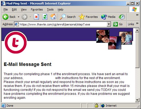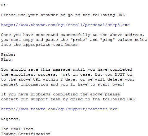 check your email and within 15mins you should receive a email from personal-cert-system@thawte.com, subject: Thawte Mail Ping.