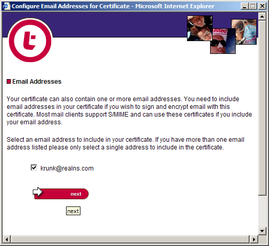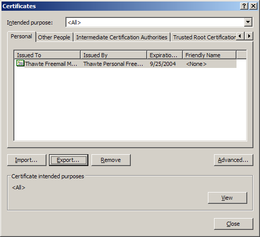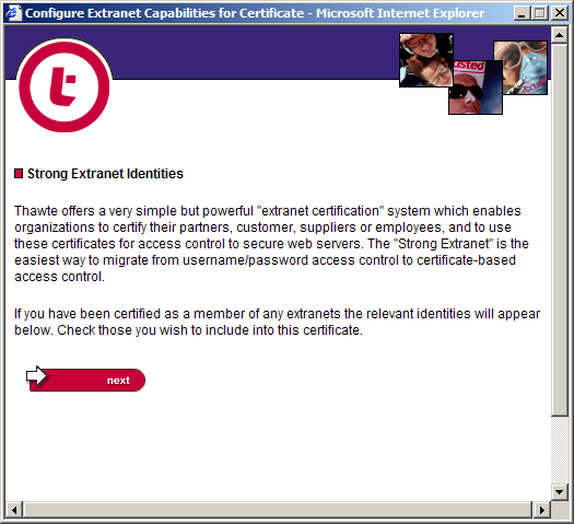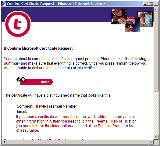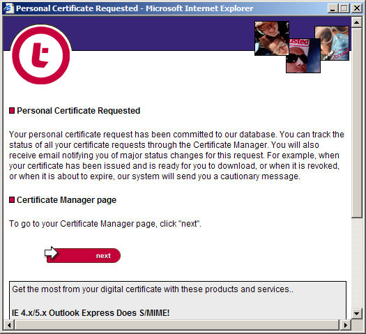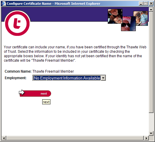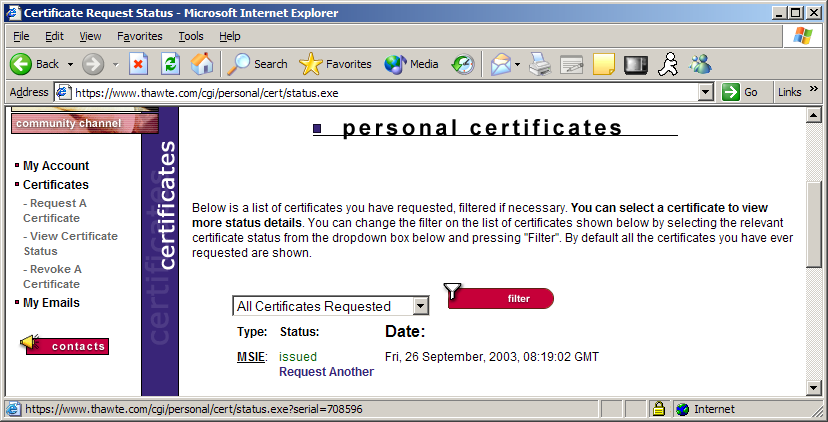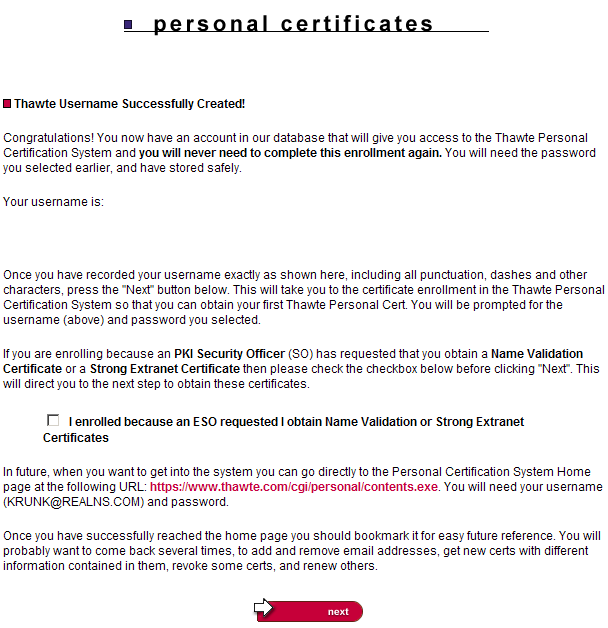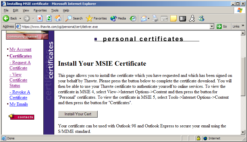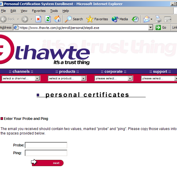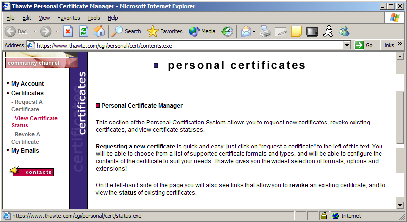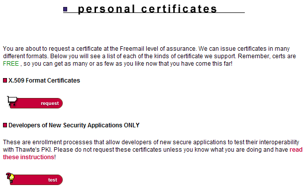 First, you'll need to get a Personal Certification from thawte.com. click here to obtain one. Your screen should look like the following: