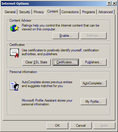 but dont lose hope, we're almost done! in Internet Explorer, goto: Tools -> Internet Options -> Content -> Certificates