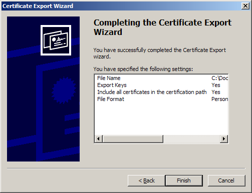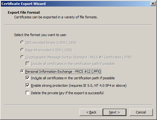 check both Include all certificates in the certification path if possible & Enable strong protection (requires IE 5.0, NT 4.0 SP4 or above)