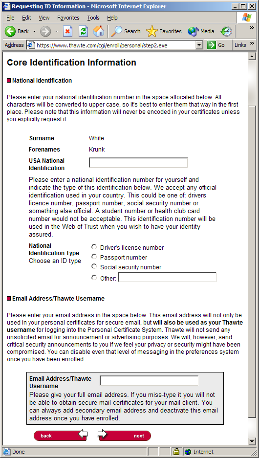 enter your choice of which personal information you are willing to give up to thawte.com into USA National Identification and select the corresponding National Identification Type